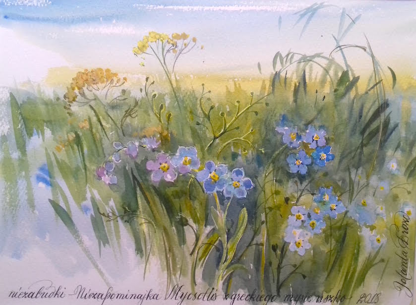 tworząc akwarelową kompozycję zostawiam dookoła trochę wolnej przestrzeni na kaligrafię. Mój malowany ogród oplatam sentencjami, łacińskimi nazwami oraz fragmentami wierszy.