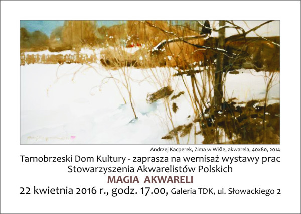 Serdecznie zapraszamy na wernisaż wystawy Stowarzyszenia Akwarelistów Polskich, który odbędzie się 22. kwietnia o godzinie 17, w Tarnobrzeskim Domu Kultury ul. Słowackiego 2. Wystawa trwa od 25.04 do 15.05.2016 r.