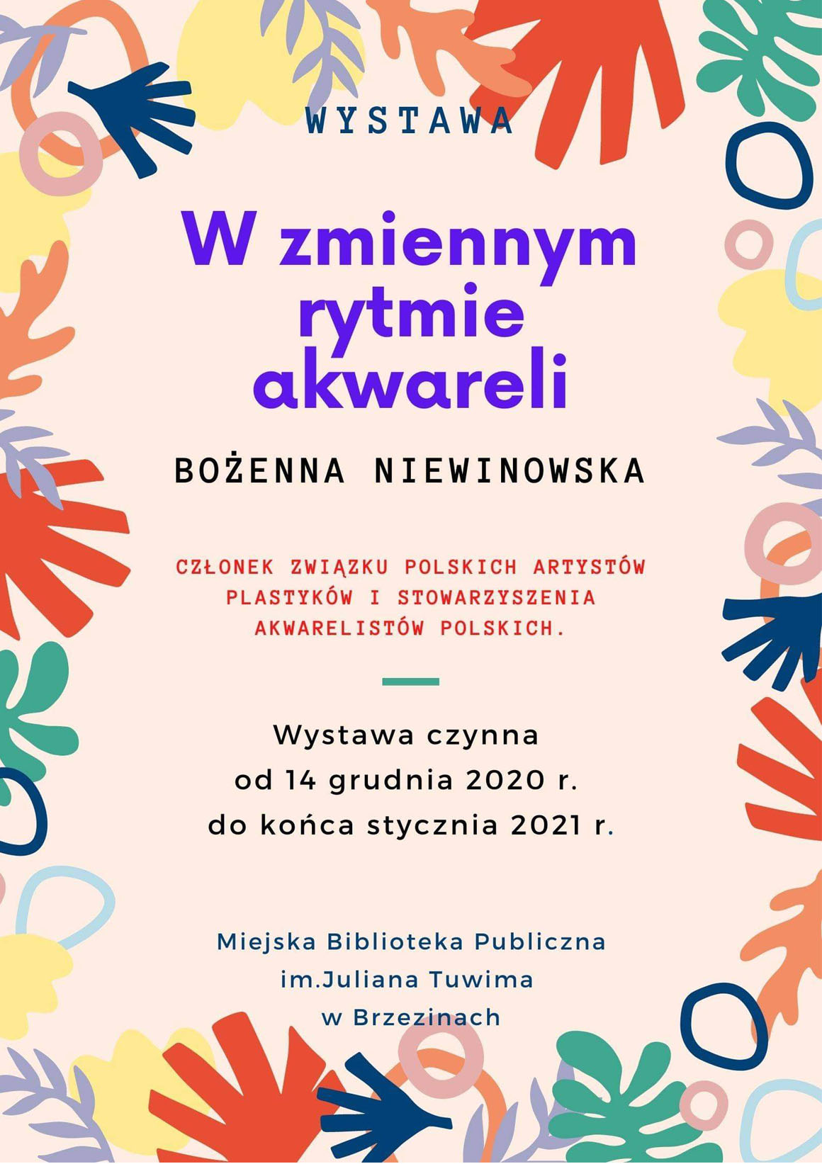 Serdecznie zapraszamy na wystawę "W zmiennym rytmie akwareli" Bożenny Niewinowskiej do Miejskiej Biblioteki Publicznej w Brzezinach. Wystawa otwarta do końca stycznia 2021 r.