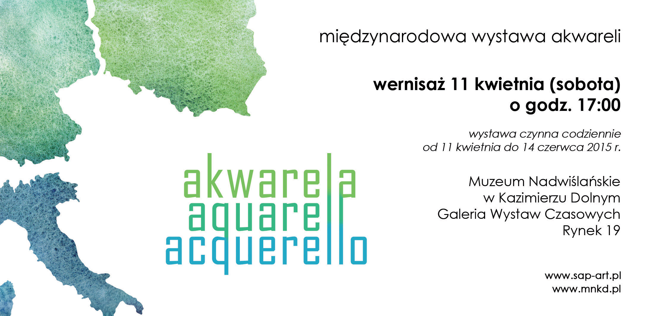 Otwarcie I Międzynarodowej Wystawy Akwareli odbędzie się 11 kwietnia 2015 r. o godz. 17:00 w Muzeum Nadwiślańskim, ul. Rynek 19 w Kazimierzu Dolnym. Wystawa zawiera około 150 prac akwarelistów z stowarzyszenia włoskiego AIA, niemieckiego DAG oraz naszego SAP i potrwa do 14 czerwca 2015 r.