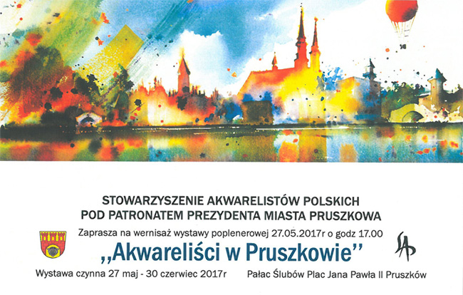 Stowarzyszenie Akwarelistów Polskich pod patronatem Prezydenta Miasta Pruszkowa zaprasza na wernisaż wystawy poplenerowej 27.05.2017 o godz. 17:00 do Pałacu Ślubów w Pruszkowie. Wystawa czynna do 30 czerwca 2017r.