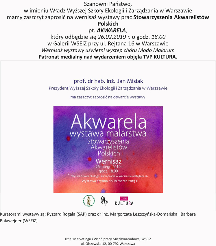 To już chyba ostatni przystanek wędrującej wystawy Stowarzyszenia Akwarelistów Polskich 2018. Tym razem zapraszamy na wernisaż w Wyższej Szkole Ekologii i Zarządzania w Warszawie.