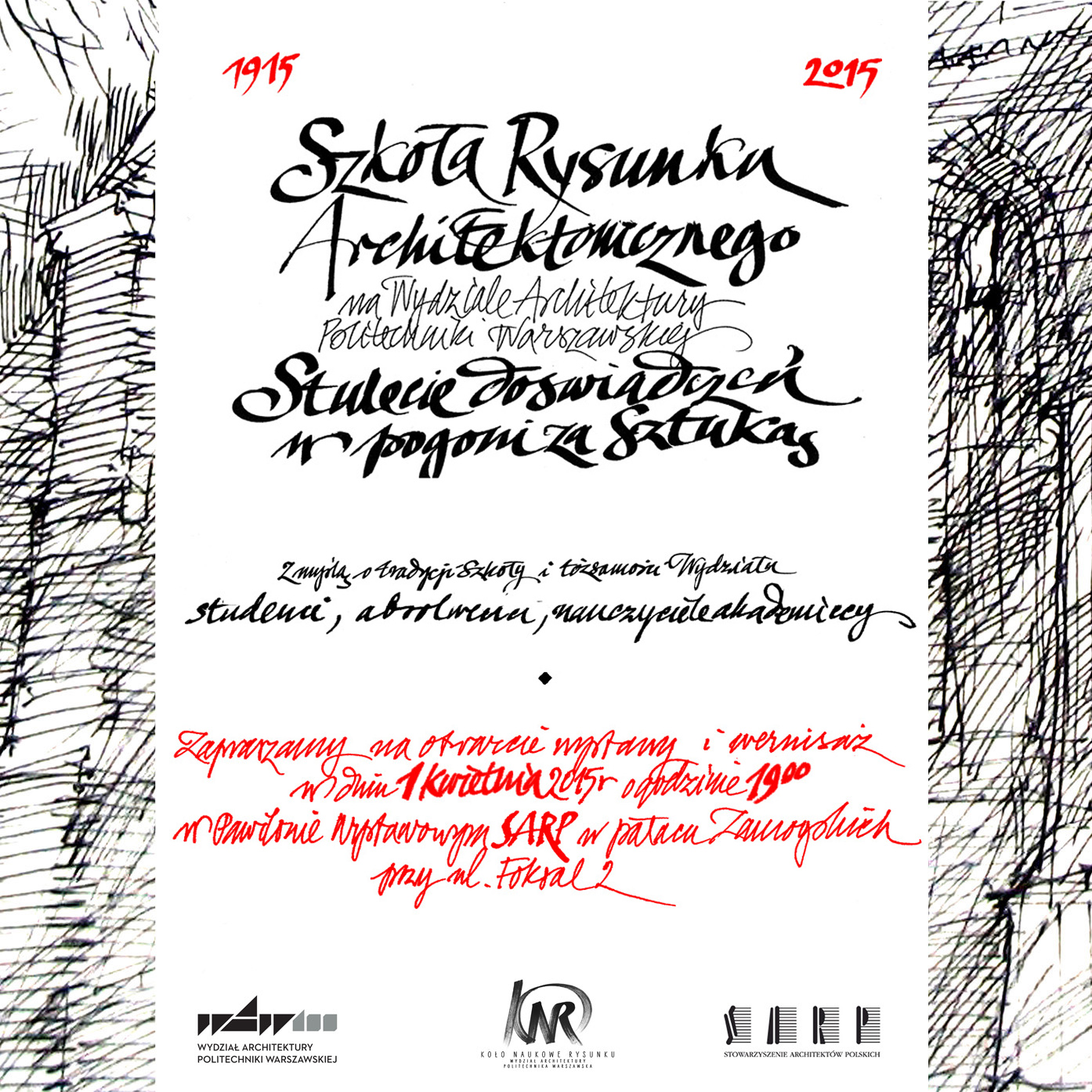 Zapraszamy na wernisaż wystawy prezentującej dorobek rysunkowy studentów, absolwentów i nauczycieli akademickich w dniu 1 kwietnia 2015 roku o godzinie 19:00 w Pawilonie Wystawowym SARP w Pałacu Zamoyskich przy ul. Foksal 2 w Warszawie.