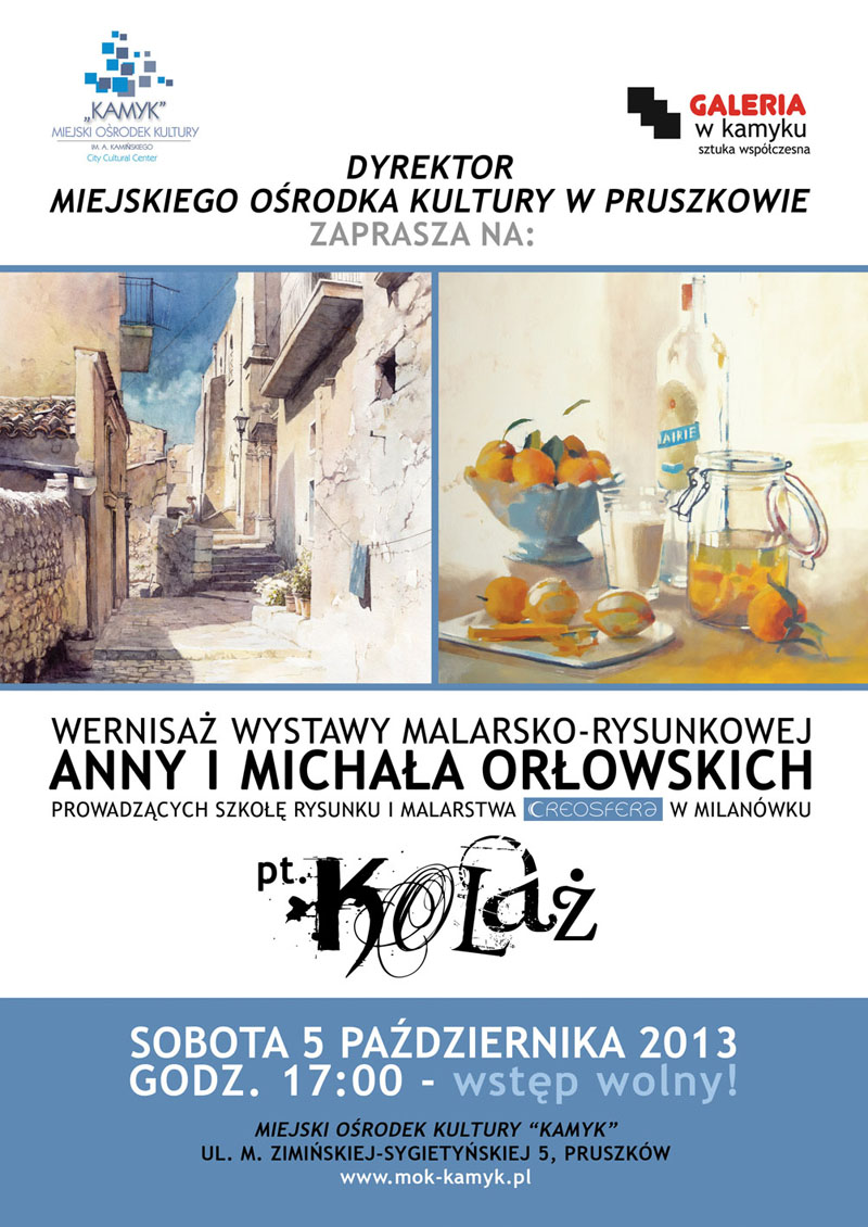 Serdecznie zapraszamy na wernisaż wystawy Ani i Michała Orłowskich pt. "Kolaż" - w sobotę 5 października o godz. 17:00 w Miejskim Ośrodku Kultury w Pruszkowie.