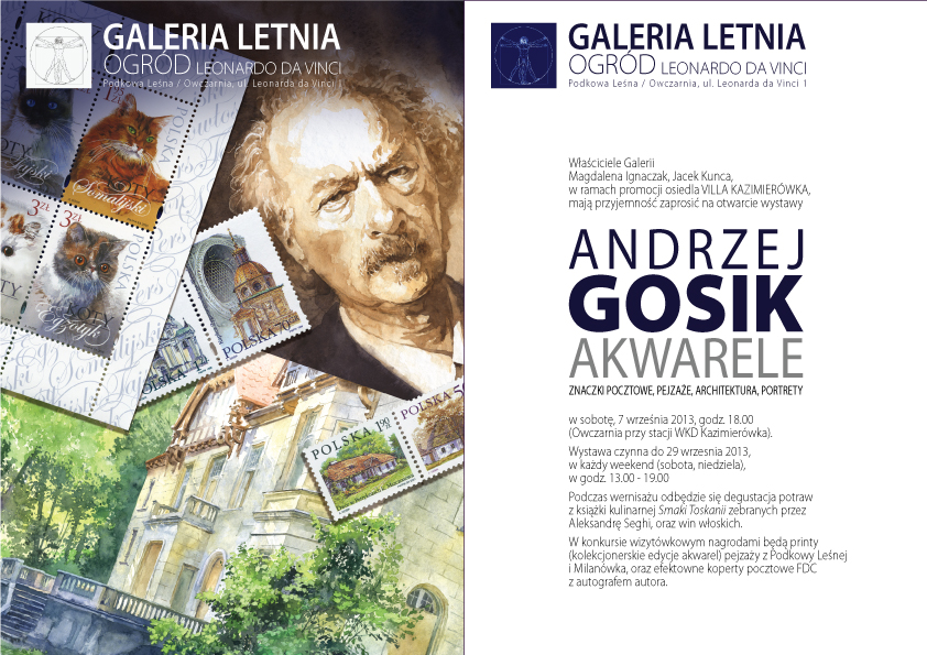 Zapraszamy na wernisaż wystawy akwareli Andrzeja Gosika, 7 września 2013, godz. 18:00 w Owczarni przy stacji WKD Kazimierówka, ul. Leonarda da Vinci 1.