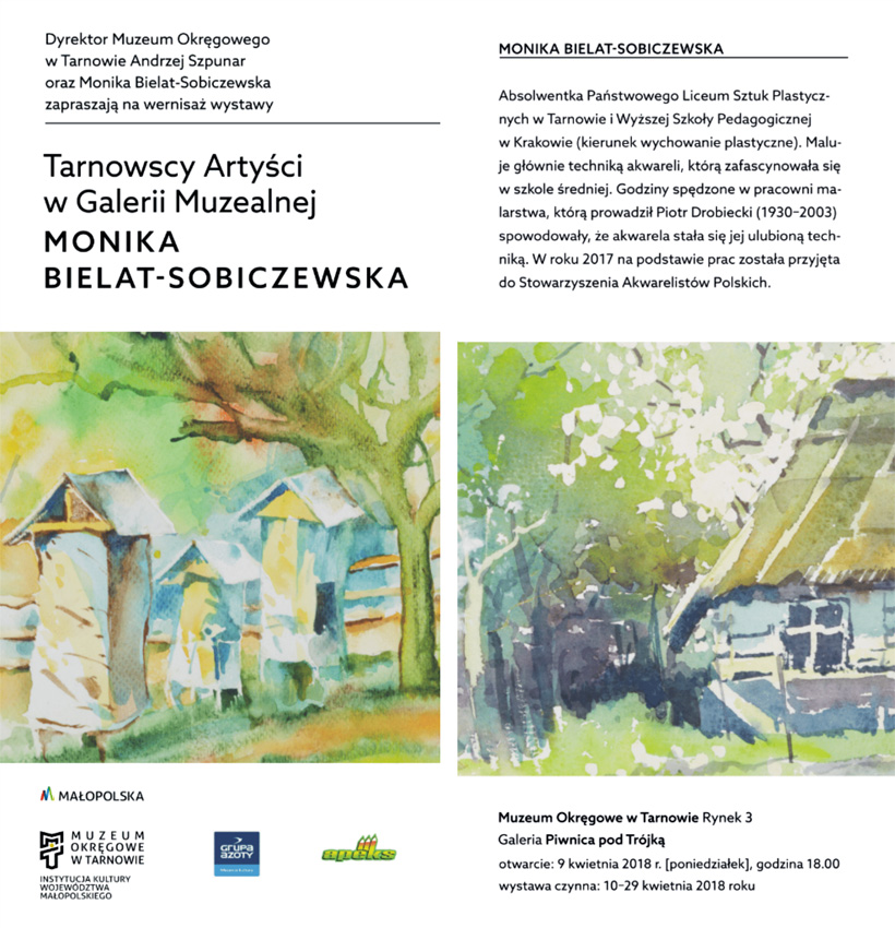 Serdecznie zapraszam 9 kwietnia 2018 r. o godz 18.00 na retrospektywną wystawę moich akwarel, która odbędzie się w Tarnowie w Muzeum Okręgowym Rynek 3.