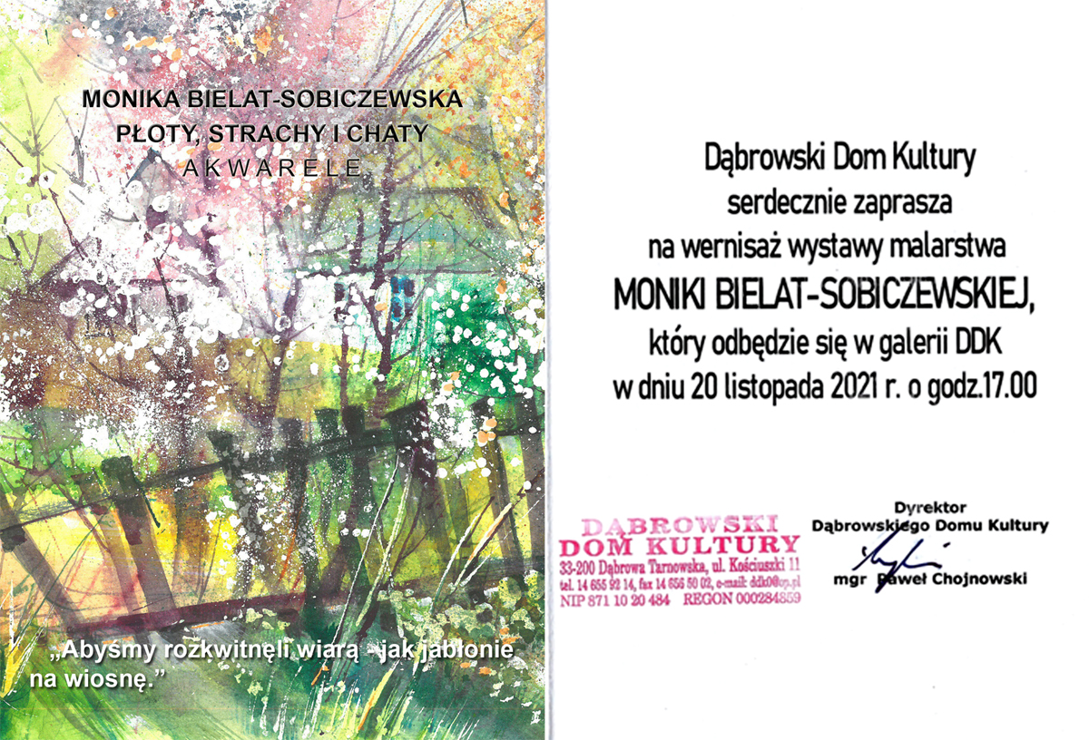 SAP oraz Dąbrowski Dom Kultury serdecznie zapraszają na wernisaż wystawy malarstwa Moniki Bielat-Sobiczewskiej który odbędzie się 20 listopada o godzinie 17:00 w Galerii Dąbrowskiego Domu Kultury ul. Kościuszki 11, Dąbrowa Tarnowska. Wystawa otwarta do 15 grudnia 2021 r.