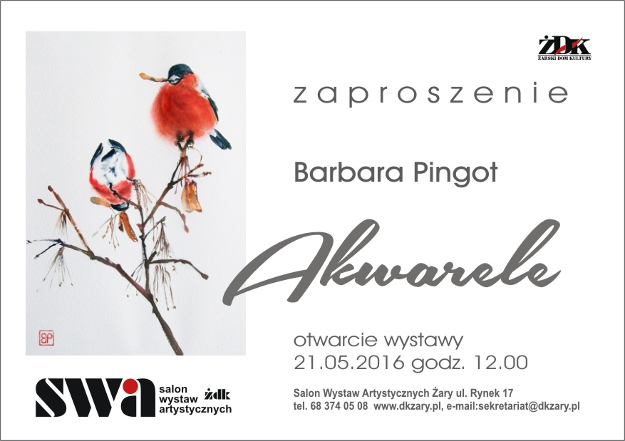 Serdecznie zapraszam na wernisaż wystawy moich akwareli 21. maja w Salonie Wystaw Artystycznych w Żarach.  Wystawionych będzie 50 prac w różnej tematyce, wystawa trwa do 15 czerwca 2016r.