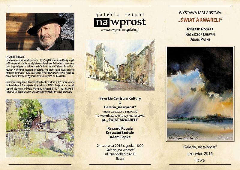 Ryszard Rogala, Krzystof Ludwin i Adam Papke mają zaszczyt zaprosić na wernisaż wystawy malarstwa "ŚWIAT AKWARELI" w Galerii "na wprost" w Iławie.