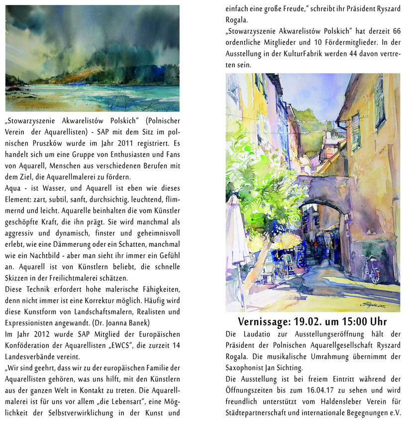 Serdecznie zapraszamy na wernisaż wystawy SAP „DIE WELT IN AQUARELL” w Kunstgelerie in der KulturFabrik, Gerikestraße 3a w Haldensleben, 19 lutego 2017 o godz. 15:00. Wystawa będzie trwała od 19.02 do 16.04.2017.